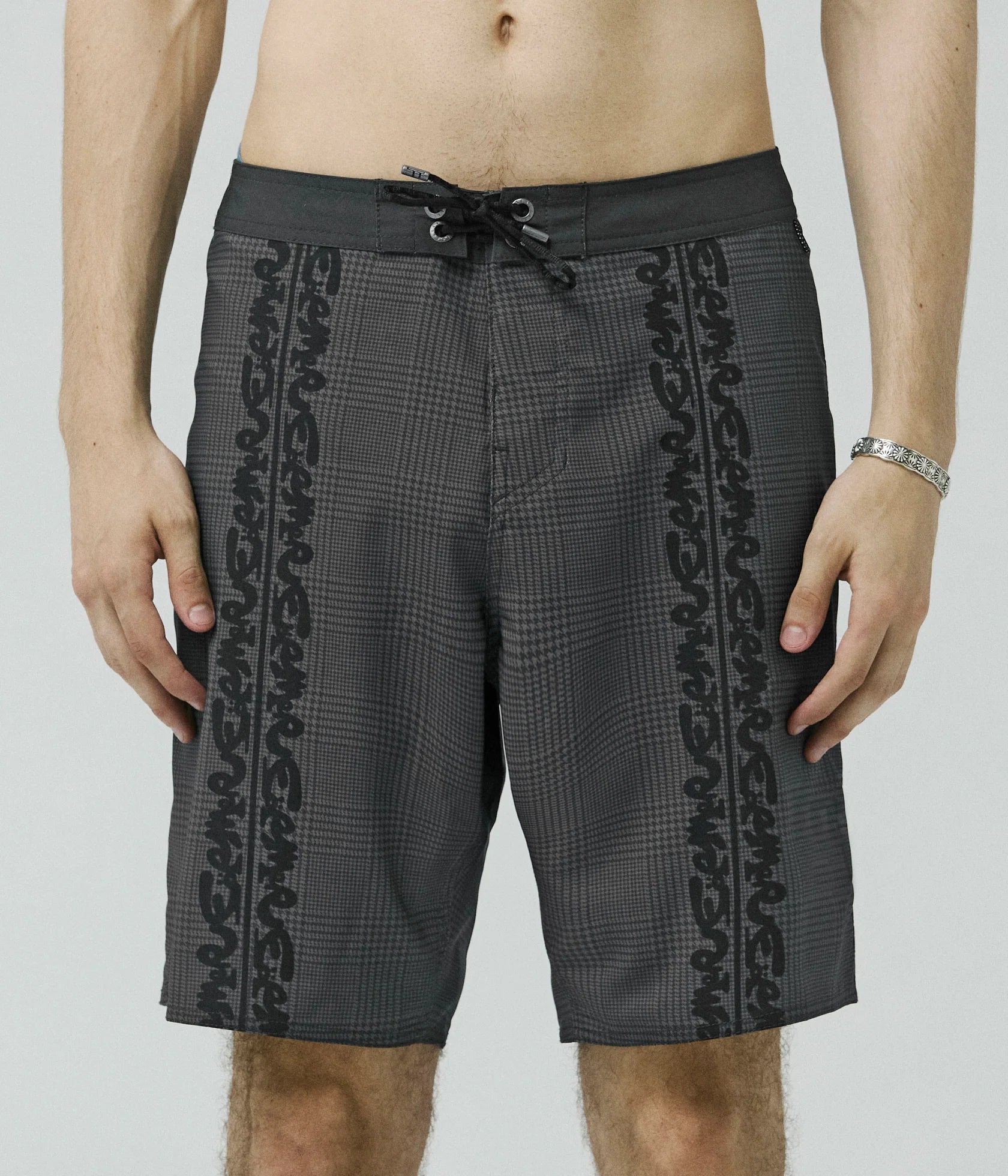Constructed from a premium polyester-elastane blend (93% polyester 7% elastane) 4-way stretch fabric. Delivered in our Anderson 18.5" trunk fit. Featuring sublimated yardage print with screenprint front graphic, invisible concealed coil zip with Legacy woven zip puller, elastic key loop, and fixed waist.