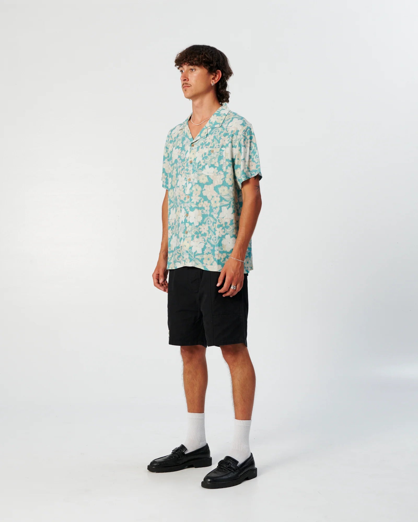 The Astro Resort Shirt is a printed linen shirt with coconut buttons and a resort collar. Fit is slightly ovresize and fabric is beautiful and soft. Our guy is 6'2" and wearing a size Large. We recommend taking your regular size.