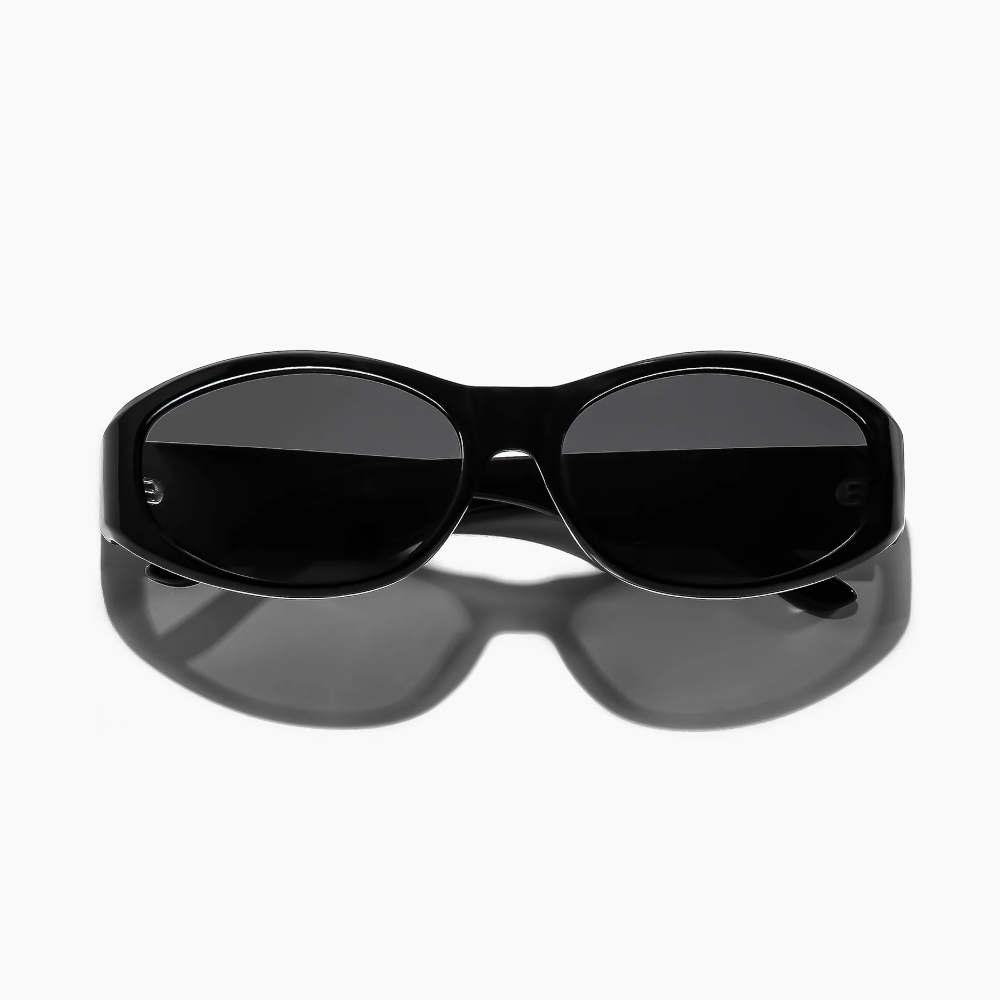 meet brooks ; funky meets functional in these versatile oval sunglasses featuring a slightly wrapped base curve. ultra cool proportions with sharp bevelling will make this black on black sunglass your summer go-to.
