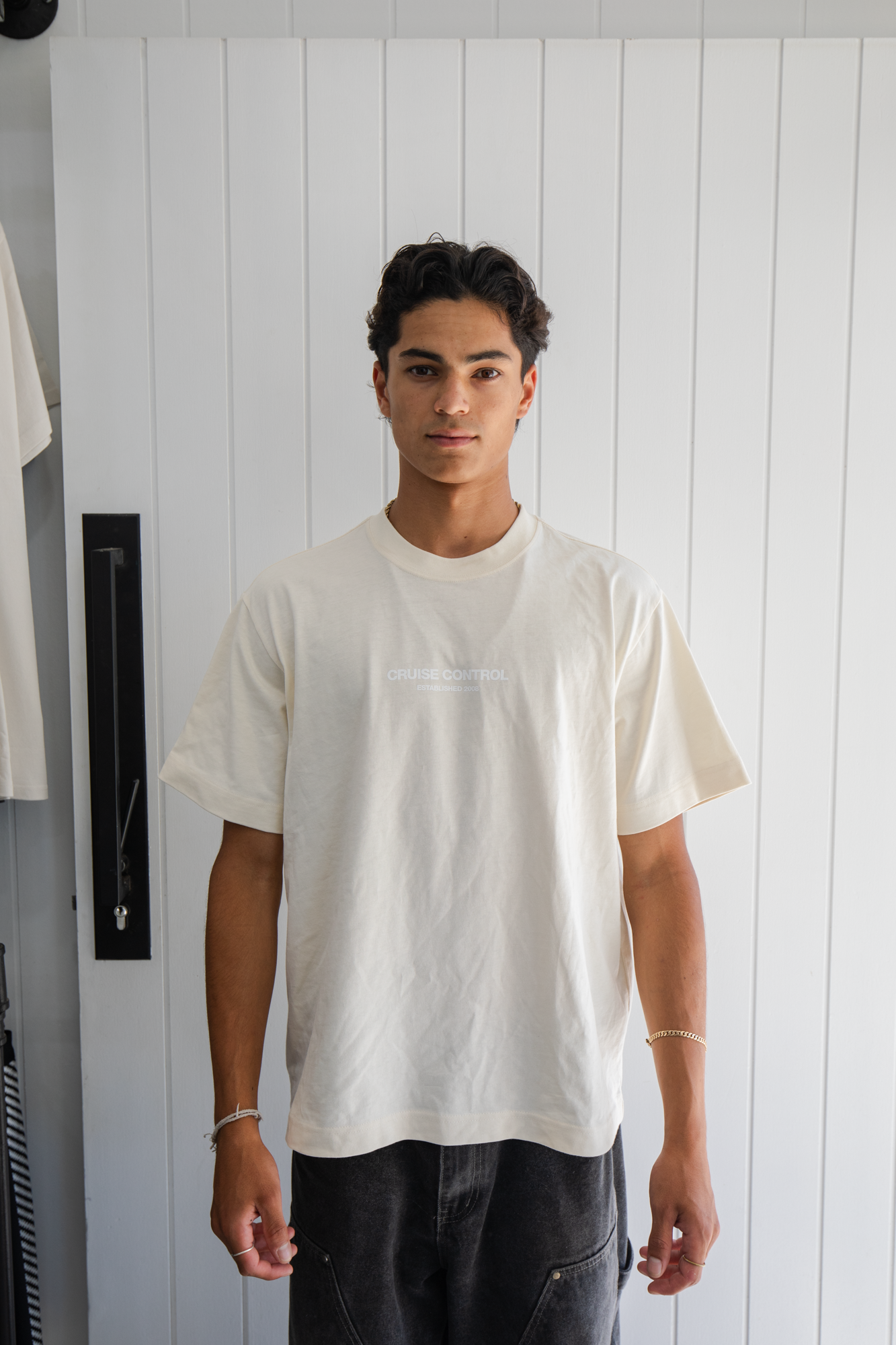 Join the summer club with the box fit cruise control tee in ecru