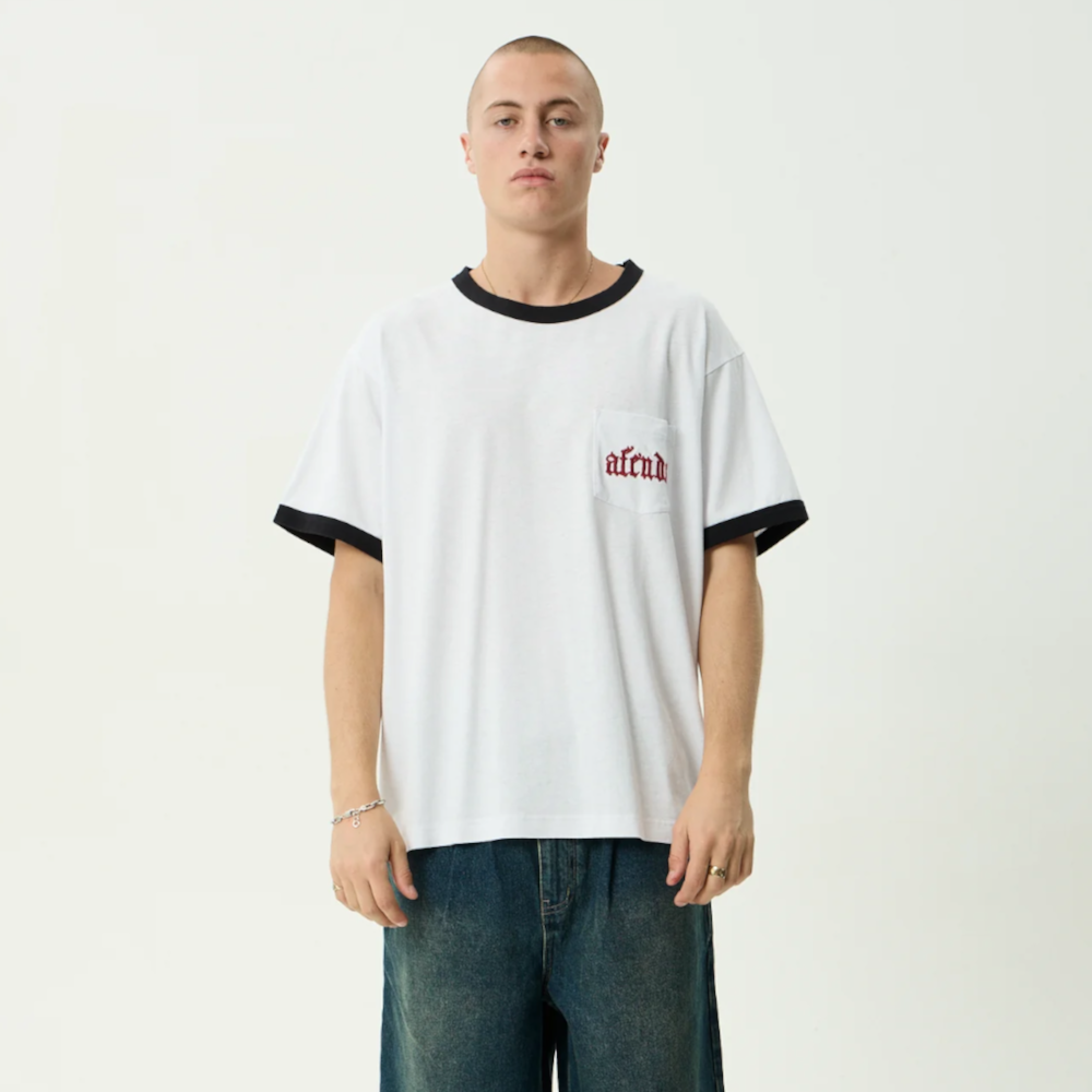 This season, our in house graphics are inspired by going back to our roots, capturing a core AFENDS feel while leaning into skate and streetwear, with strong nods to tattoo culture throughout the designs. This boxy tee is designed with ribbed contrast neck and sleeve binds for a classic ringer tee look, made in our lightweight hemp jersey blend fabric.