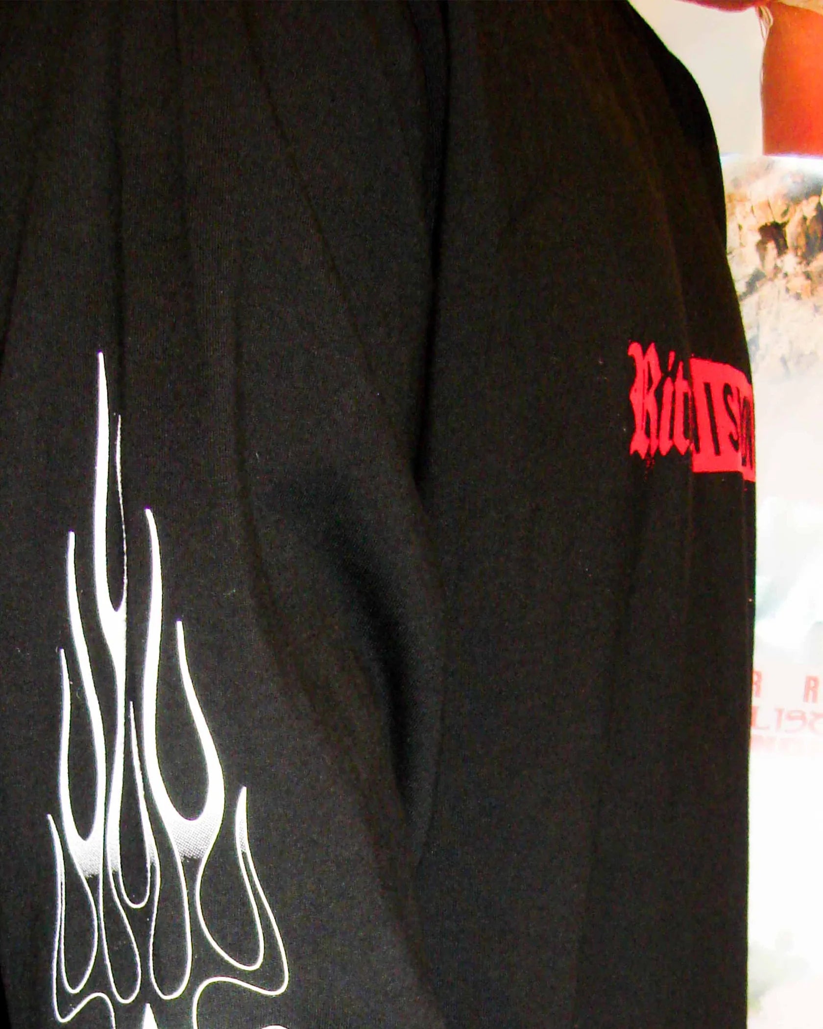 The Flame Long Sleeve Tee in Black is delivered on our custom Ritual LS fit, it is 100% Cotton, 240GSM, perfect unisex fitting tee. The LS Flame Tee combines the signature flame print for a sleeve hit, with the Ritual logo on the front, and on the back the line up of the Ritual family of frames, giving the tee a vibe of the old festival tees we loved.