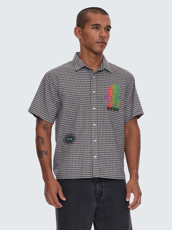 Gritty, raw, and rooted in punk heritage, the Its In The Cards Short Sleeve Cropped Shirt in Black channels Thrills DIY spirit straight out of AustraliaÕs pub music scene. Cut from a blend of cotton and linen yarn dye check, this piece from our shirts sale Australia selection blends breathable fabrication with attitude, featuring cropped proportions, a button-down front, and bold multi-print applications for a standout finish. Designed to pair easily with baggy denim jeans or layered over a basic men's tee, this is a summer must-have.