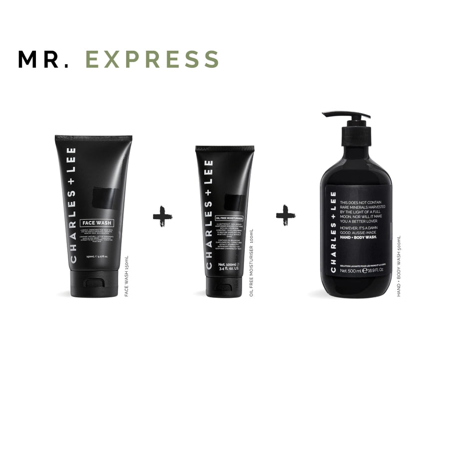 THIS SET DOES’T ROCKET YOU TO THE STRATOSHPERE, BUT IT DOES ELEVATE YOUR SKIN TO NEW HEIGHTS. MR. EXPRESS gift set includes: 1 x Face Wash 150mL 1 x Oil Free Moisturiser 100mL 1 x Hand + Body Wash 500mL 1 x Charles + Lee Premium Toiletries Bag