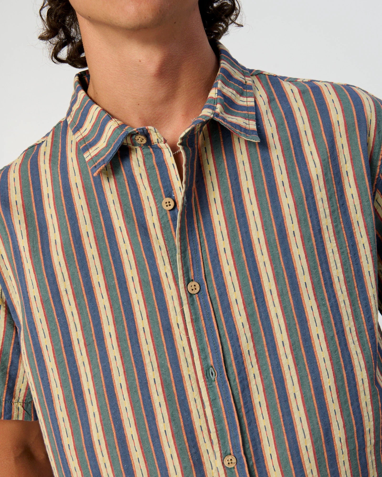 The Temple Shirt is a printed seersucker shirt with with a standard collar and coconut buttons for a touch of texture. A versatile piece you can dress up or throw on as an easy layer. Our guy is 6'2" and wearing a size Large. We recommend taking your regular size.